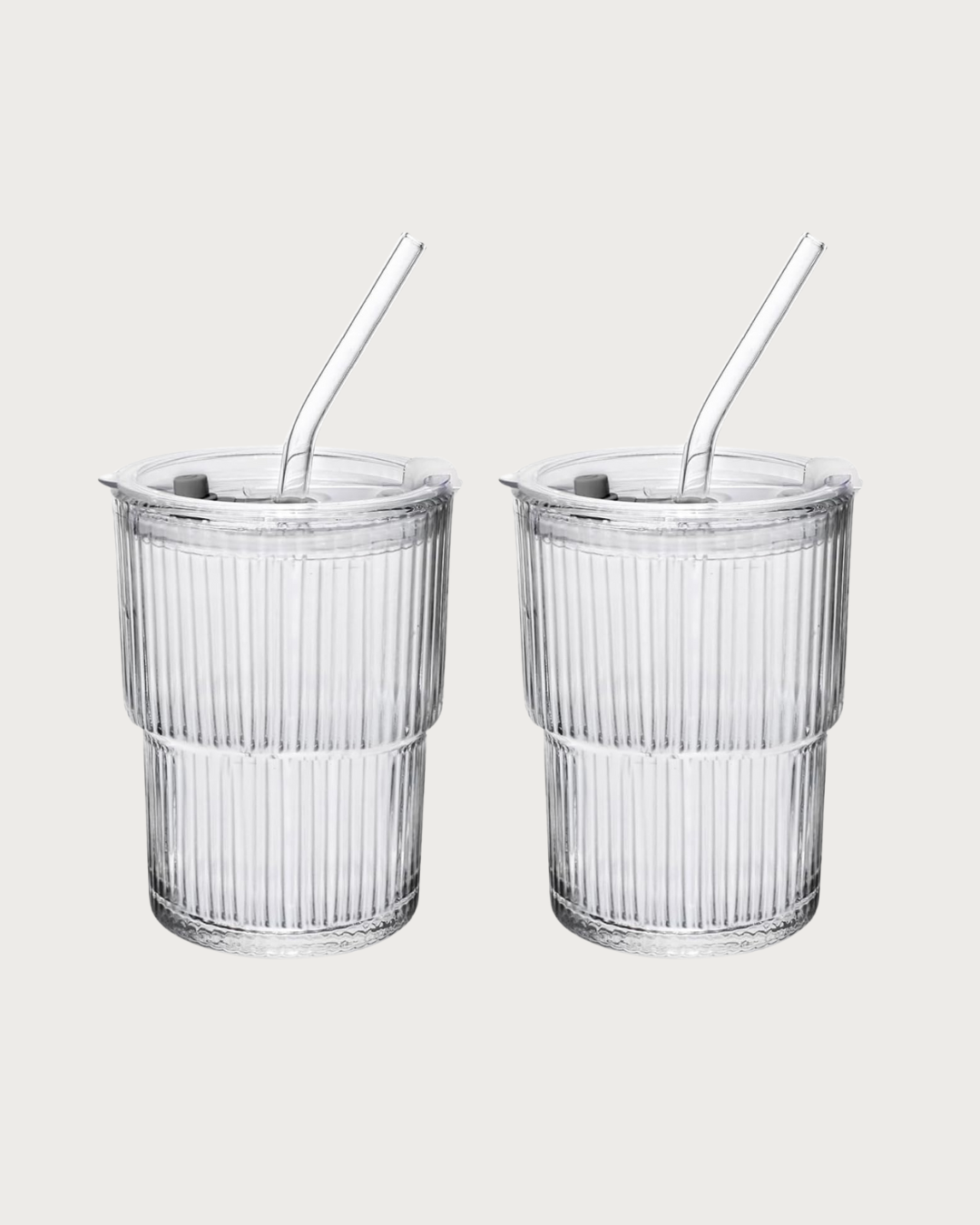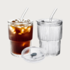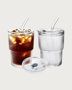 כוס שתייה מזכוכית עמידה ומעוטרת הכוללת מכסה וקשית רב פעמית בעיצוב מלא בסטייל.