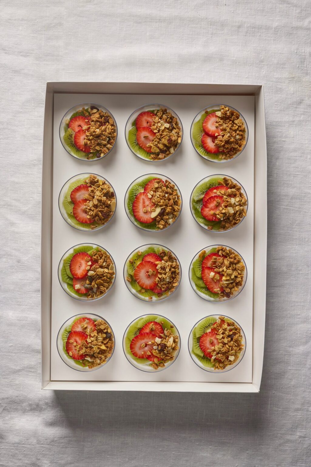 מגש מוזלי – כוסות יוגורט, פירות וגרנולה (12 יח׳ במגש)